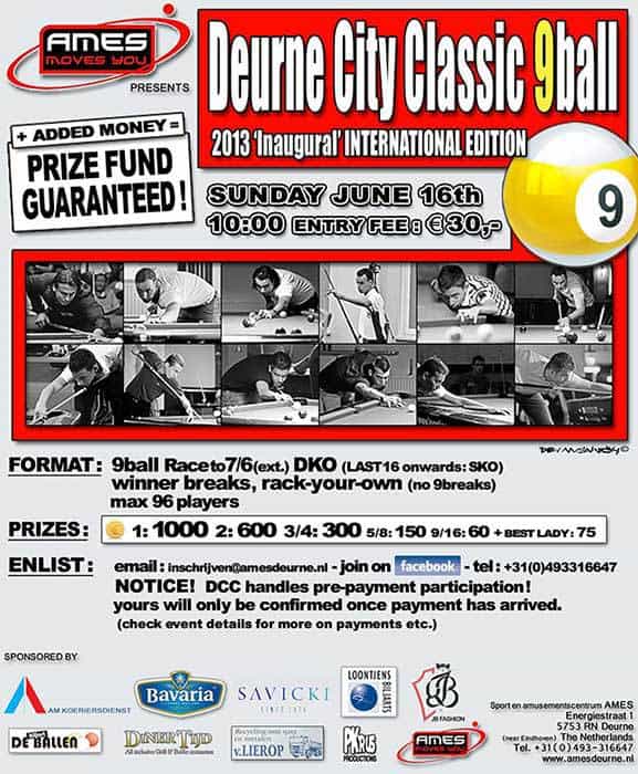 Am kommenden Sonntag, den 16. Juni findet in Deurne/Niederlande die Deurne City Classic 9 Ball 2013 statt. Das Turnier wurde recht kurzfristig geplant, dennoch haben sich bis heute mehr als 90 Spieler bei diesem Event registriert. Das 9 Ball Turnier war anfänglich auf 64 Teilnehmer begrenzt, aufgrund der großen Resonanz hat man sich entschieden die Startplätze ein wenig zu erweitern. Ich bin gespannt, ob der Zeitplan nicht aus dem Rahmen fällt 😉  Das Gesamtpreisgeld beträgt mehr als 3.000 Euro, nicht schlecht für ein Eintagesturnier. Das Starterfeld kann sich mehr als sehen lassen, viele internationale Topspieler gehen bei unseren holländischen Freunden an den Start. Darunter Namen wie z.B: Ivo Aarts (NED), Klaudio Kerec (GER), Karlo Dalmatin (CRO), Lars Kuckherm (GER), Joshua Filler (GER), Can Salim-Giasar (GER), Marc Bijsterbosch (NED), Stefan Nölle (GER), Wojciech Szewczyk (POL), Mateusz Sniegocki (POL), Roy Gerards (NED), Marco Teutscher (NED) sowie der Topfavorit des Turniers Nick van den Berg (NED – EPBF Player of the Year 2012). Neben der Hauptveranstaltung wird es einige Side-Events geben, ein 10 Ball Ring Game und ein 14.1 Shootout. Viele weitere Informationen, das komplette Starterfeld und Ergebnisse gibt es auf der angelegten Facebookseite.