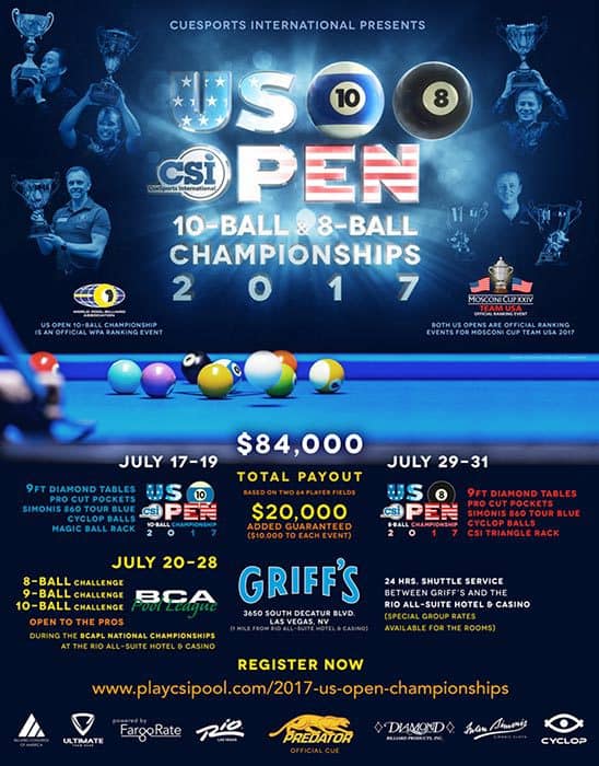 Ab dem kommenden Montag, den 17. Juli 2017 finden in Las Vegas die US Open 10 Ball Championship statt. Bis zum darauffolgenden Mittwoch, den 19. Juli 2017 werden viele internationale Top-Spieler um ein Preisgeld von ca. 85.000$ spielen. Im letzten Jahr wurden diese Wettbewerbe noch auf sogenannten Bar Tables (7 Fuß) ausgetragen. Die „kleinen“ Tische sind in den USA sehr beliebt, allerdings kann man z.B. in Europa mit dieser Tischgröße nicht viel anfangen. Dadurch sind die US Open 8 Ball und 10 Ball im Jahr 2016 ein wenig untergegangen. In diesem Jahr hat der Veranstalter CueSports International beschlossen während der laufenden nationalen US Meisterschaft wieder auf die 9 Fuß Tische zu wechseln. Eine gute Entscheidung wie wir finden. Die US Open 8 Ball Championship finden 10 Tage später vom 29. – 31. Juli 2017 statt. Titelverteidiger dieser beiden US Open Veranstaltungen ist Shane Van Boening, er gewann beide Titel im Vorjahr relativ souverän –> US Open 8 Ball & 10 Ball Championships 2016. Natürlich gehört der US Superstar auch in diesem Jahr wieder zu den Favoriten auf diese begehrten Titel. Einige weitere Favoriten sind u.a.: Dennis Orcollo (PHI), Alex Pagulayan (CAN), Lee Vann Corteza (PHI), Ralf Souquet (GER), Thorsten Hohmann (GER), Mika Immonen (FIN), Rodney Morris (USA), Skyler Woodward (USA) und Mario He (AUT).