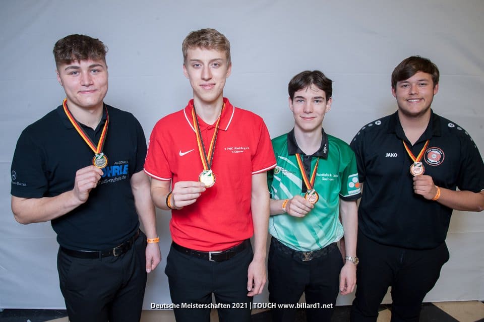 Auch bei der U19 gibt es nunmehr einen doppelten Deutschen Meister. Yuma Dörner vom PBC Wedding spielte erneut wie aus einem Guss und setzte sich auch gegen seine Nationalmannschaftskollegen Joel Schröder (PBC Kamp-Lintfort) und Clemens Ebert (Billardfabrik Leipzig) im Viertel- und Halbfinale durch. Zwar wurde es gegen den Sachsen mit 7:6 sehr knapp, doch im Finale gegen Michael Matschewsky (PBC Freudenstadt) war die vorangegangene Überlegenheit Dörners wieder spürbar. Mit 7:3 setzte sich der Zweitligaspieler durch und holte sich verdient die Goldmedaille Nummer zwei. Bis ins Halbfinale konnte sich Noah Sackers (P&B Sports Club Bergisch-Gladbach) vorspielen, ehe er gegen Matschewsky den Kürzeren zog. Lohn war aber dennoch die Bronzemedaille, die er bei der abendlichen Siegerehrung in Empfang nehmen konnte.